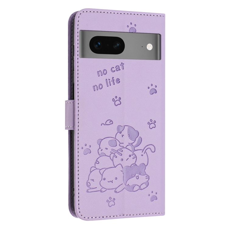 Funda de Cuero con Diseño de Gatito en Relieve para Google Pixel 7 con Cordón (Morado)