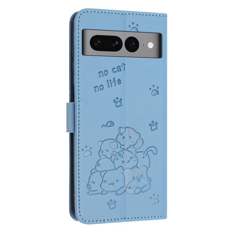 Funda de Cuero Google Pixel 7 Pro con Diseño de Gatito en Relieve y Cordón (Azul)