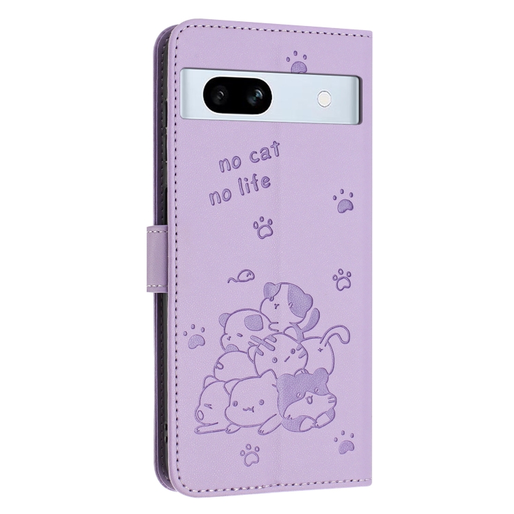 Funda de Cuero para Google Pixel 7A con Diseño de Gatito En Relieve y Cordón (Morado)