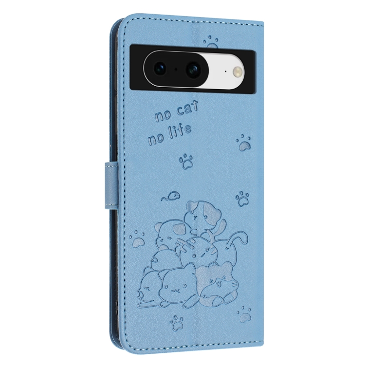 Funda de Cuero con Diseño de Gatito en Relieve para Google Pixel 8 con Cordón (Azul)