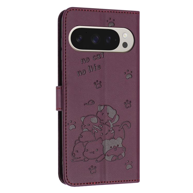 Funda de Cuero Google Pixel 9 Pro XL con Diseño de Gatito en Relieve y Cordón (Rojo Vino)