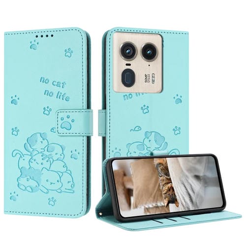 Funda de Cuero Motorola Edge 50 Ultra con Diseño de Gatito En Relieve y Cordón (Verde Menta)