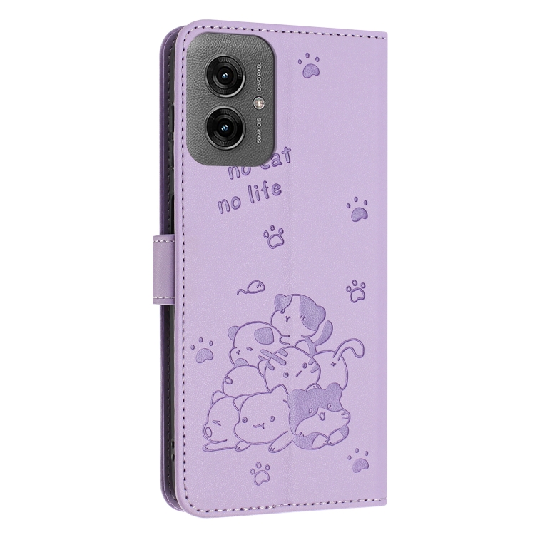 Funda de Cuero para Motorola Moto G55 con Diseño de Gatito En Relieve y Cordón (Morado)