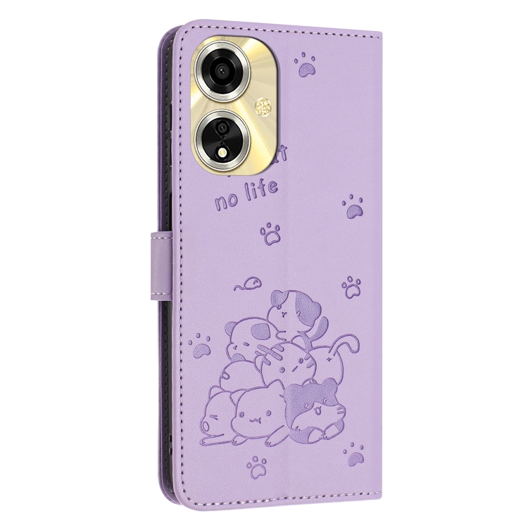 Funda de Piel con Diseño de Gatito En Relieve para Oppo A59 5G con Cordón (Morado)