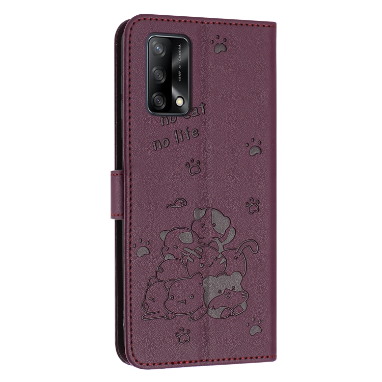 Funda de Piel con Diseño de Gatito En Relieve y Cordón para Oppo A74 4G / F19 / F19S (Rojo Vino)