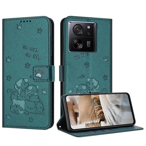 Funda de Piel con Diseño de Gatito En Relieve para Redmi K60 Ultra con Cordón (Verde Oscuro)