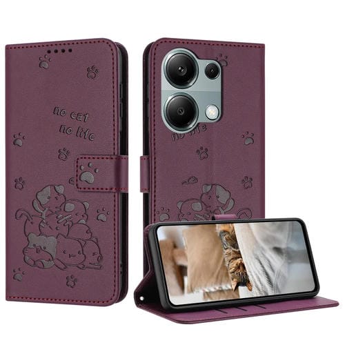 Funda de Cuero con Estampado de Gatito En Relieve Global para Redmi Note 13 Pro 4G con Cordón (Rojo Vino)