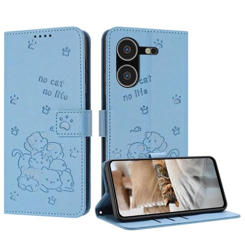 Funda de Cuero para Tecno Pova 5 con Diseño de Gatito en Relieve y Cordón (Azul)