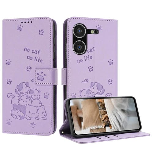 Funda de Cuero para Tecno Pova 5 con Diseño de Gatito en Relieve y Cordón (Morado)