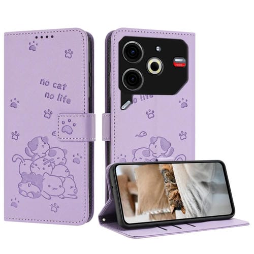 Funda de Cuero para Tecno Pova 6 Neo con Diseño de Gatito en Relieve y Cordón (Morado)
