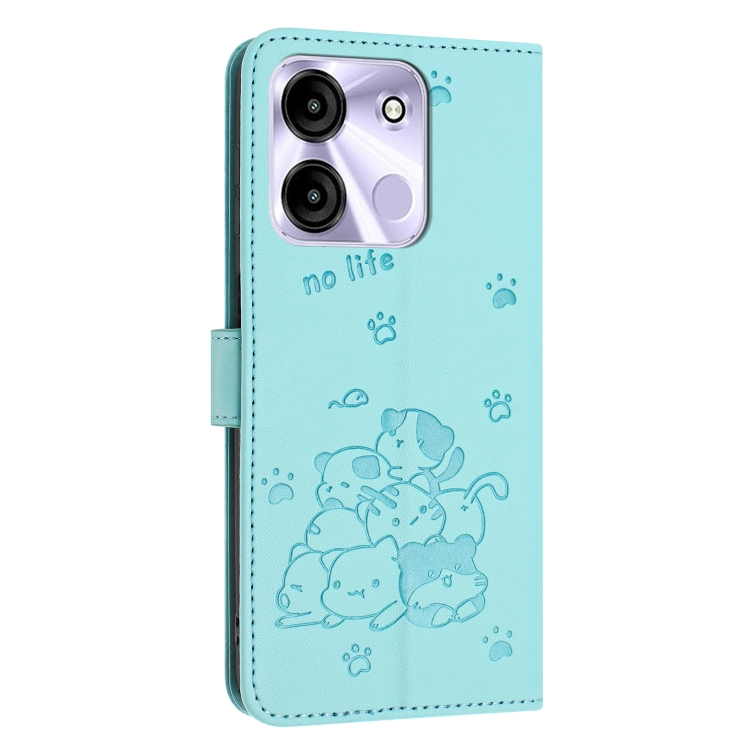 Funda de Cuero Itel A60/A60S con Diseño de Gatito en Relieve y Cordón (Verde Menta)