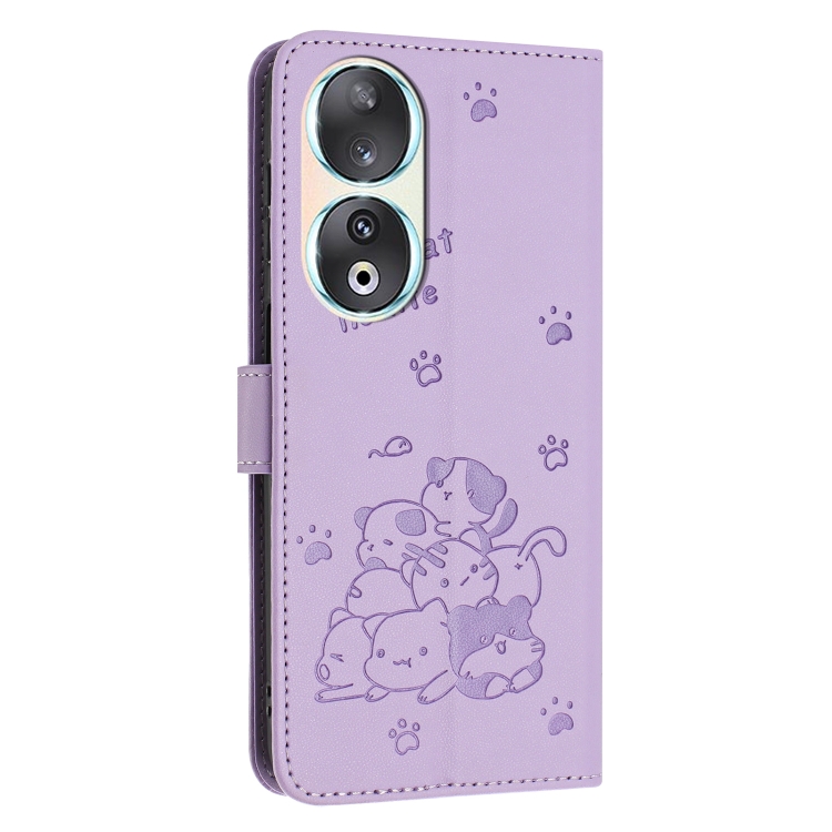 Funda de Cuero para Honor 90 con Diseño de Gatito en Relieve y Cordón (Morado)