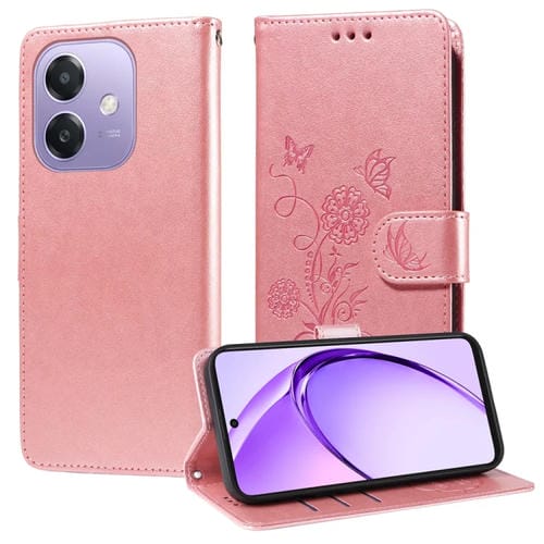 Funda de Cuero con Diseño de Mariposas y Flores En Relieve para Oppo A3X 4G/A3X 5G (Oro Rosa)