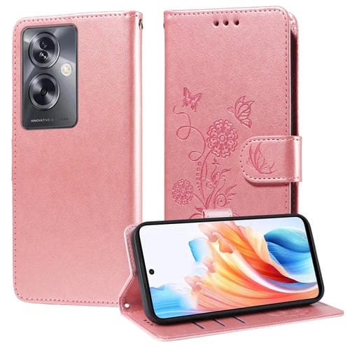 Funda de Cuero con Diseño de Mariposas y Flores En Relieve para Oppo A79 5G (Oro Rosa)