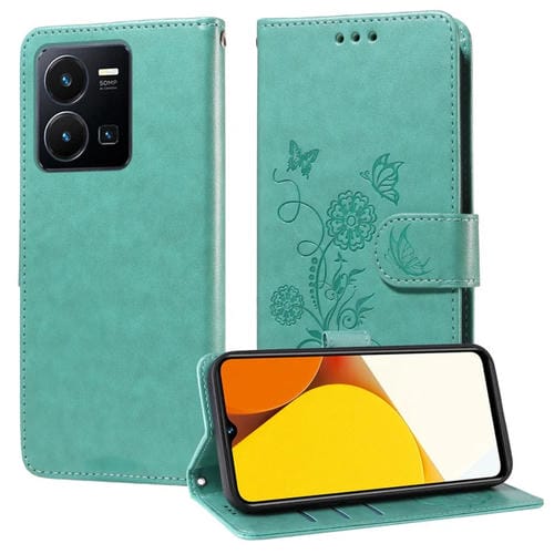 Funda de Cuero con Diseño de Mariposas y Flores En Relieve para Vivo Y35 4G / Y22S / Y22 (Verde)