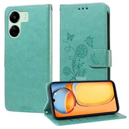 Funda de Cuero con Diseño de Mariposas y Flores En Relieve para Xiaomi Poco C65/M6 5G (Verde)