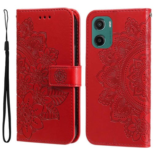 Funda de Cuero para Motorola Moto G05/E15 con Estampado de Flores de Siete Pétalos (Rojo)