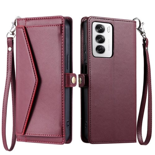 Funda de Cuero con Ranura para Múltiples Tarjetas y Billetera Global para Oppo Reno12 5G con Cordón (Rojo Vino)