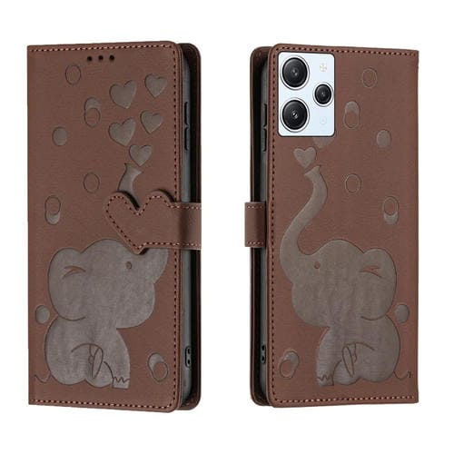 Funda de Cuero con Relieve de Elefante de Dibujos Animados para Redmi 12 4G/5G (Marrón)
