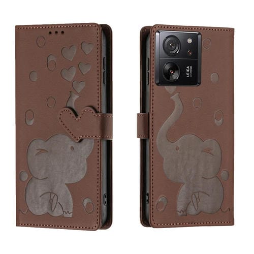 Funda de Cuero con Relieve de Elefante de Dibujos Animados para Xiaomi 13T/13T Pro (Marrón)