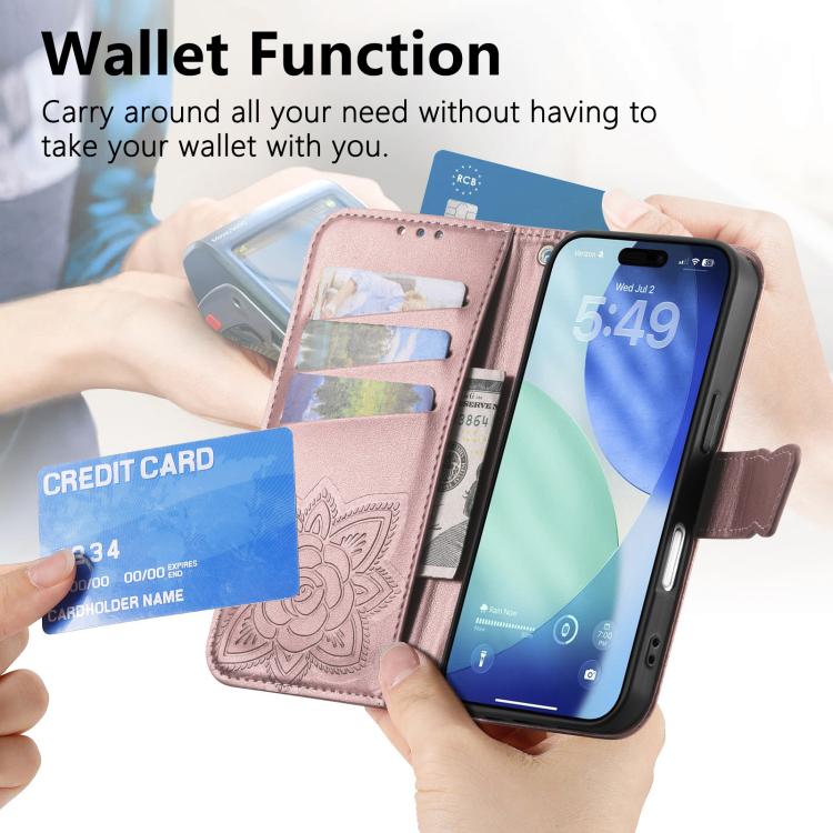 Funda de cuero con relieve de mariposa y flor para iPhone 17 Pro (oro rosa)