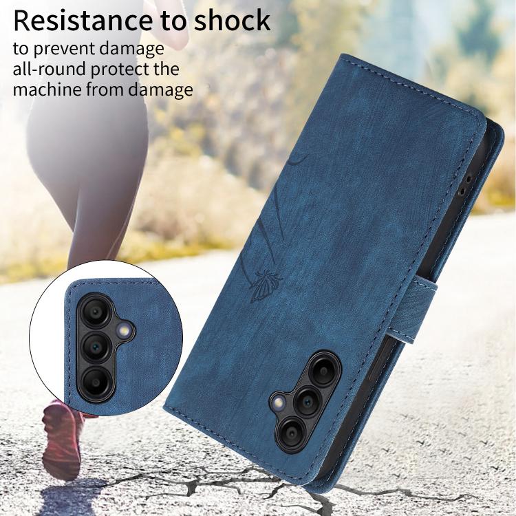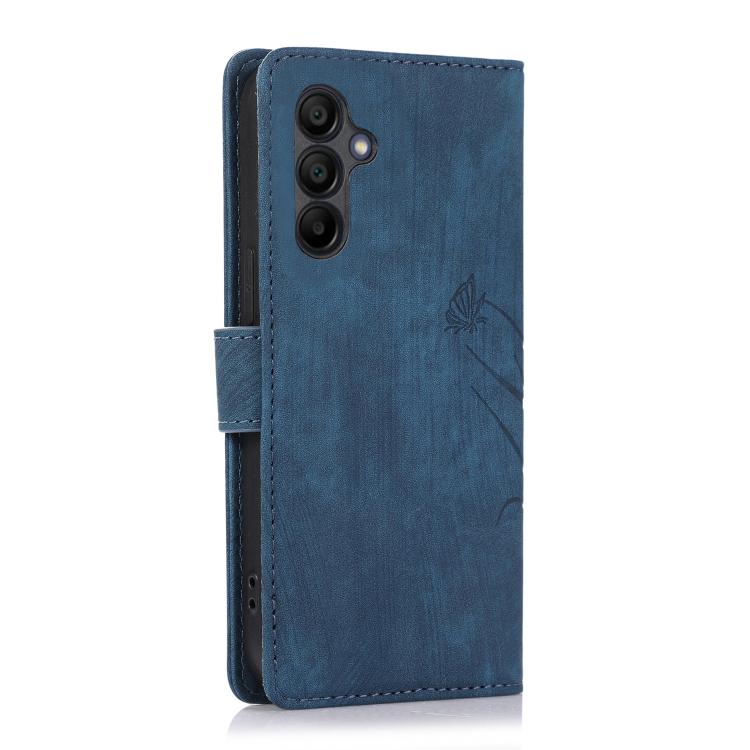 Funda de Cuero Samsung Galaxy A16 5G con Relieve de Mariposa y Orquídea (Azul)
