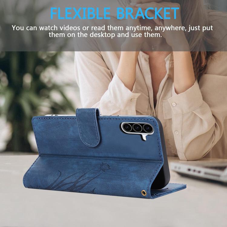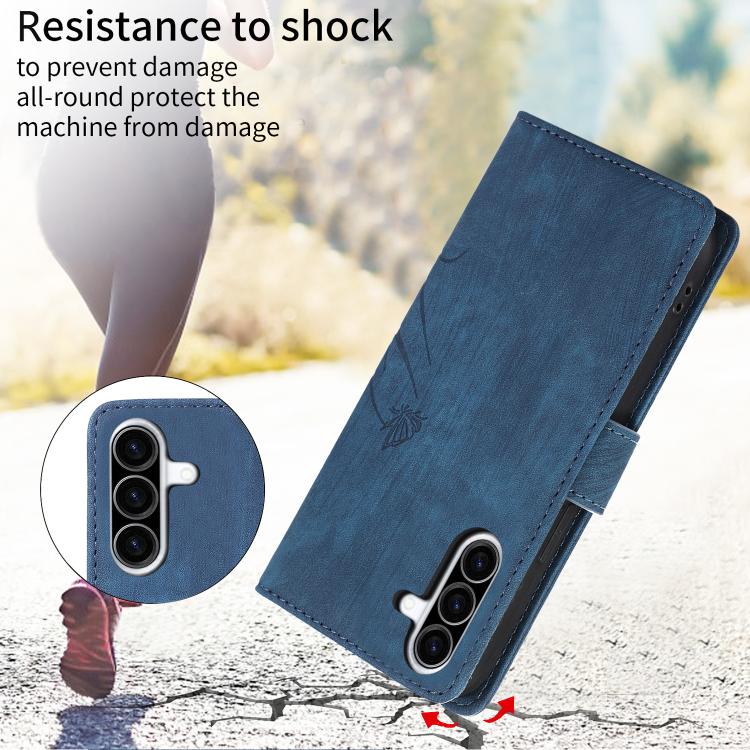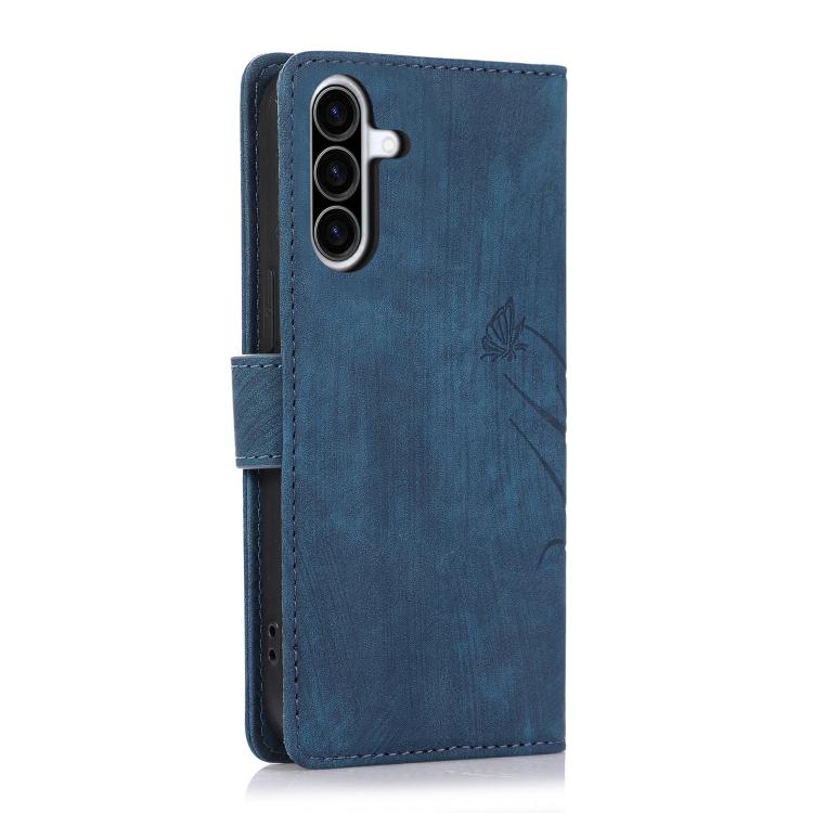 Funda de Cuero Samsung Galaxy A36 5G con Relieve de Mariposa y Orquídea (Azul)