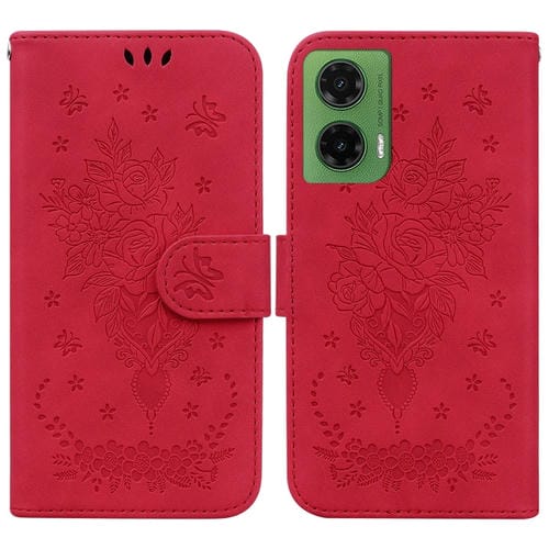 Funda de Cuero con Relieve Mariposa y Rosa para Motorola Moto G35 (Rojo)