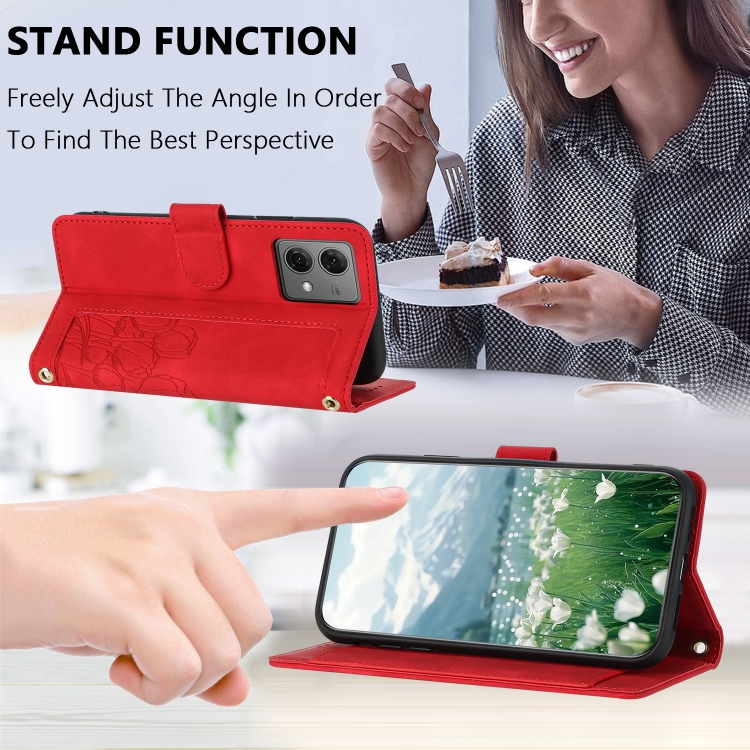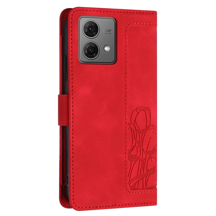Funda de Cuero con Relieve de Tulipanes para Motorola Moto G84 con Cordón (Rojo)