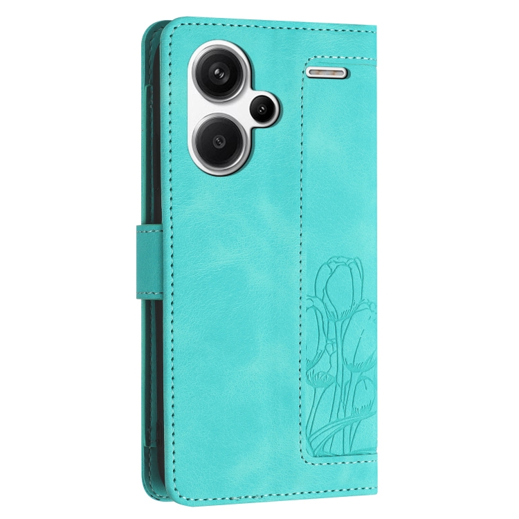 Funda de Cuero con Relieve de Tulipanes para Redmi Note 13 Pro+ 5G con Cordón (Verde)