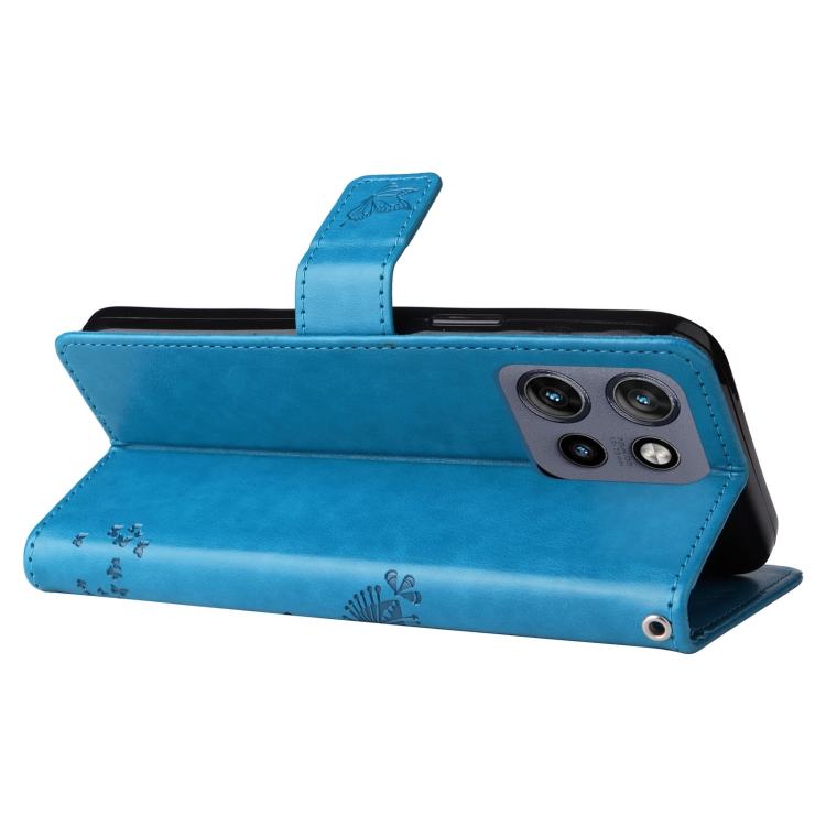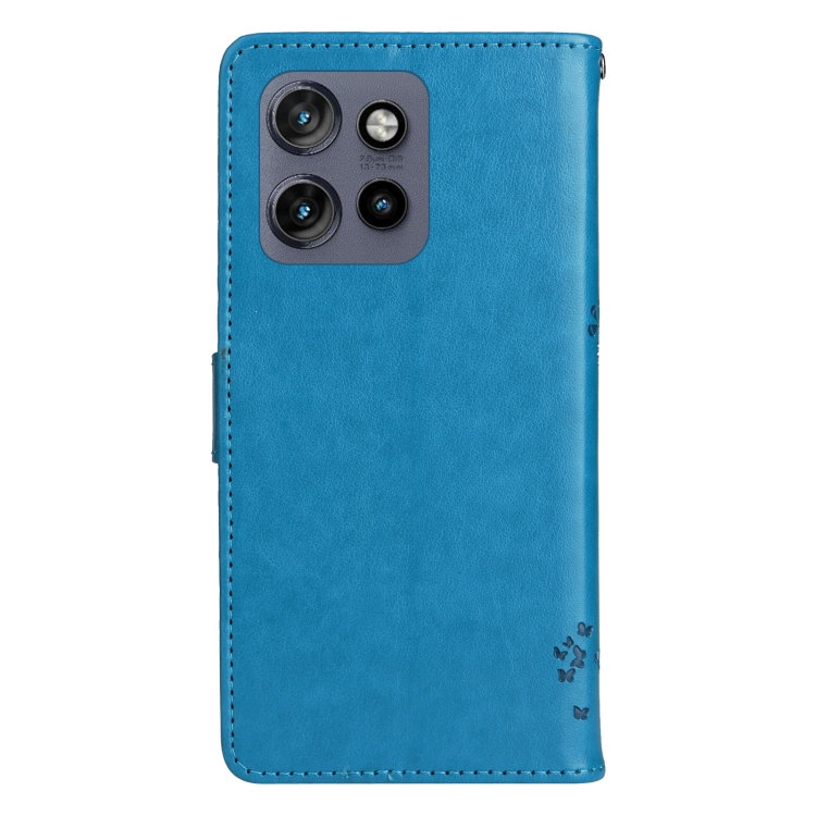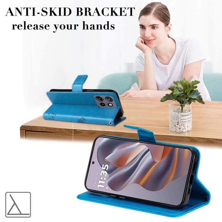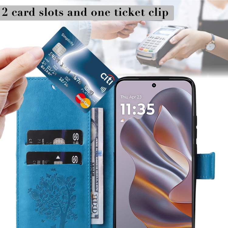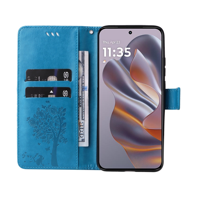 Funda de Cuero con Tapa para Motorola Edge 50 Neo con Diseño Árbol y Gato en Relieve (Azul)