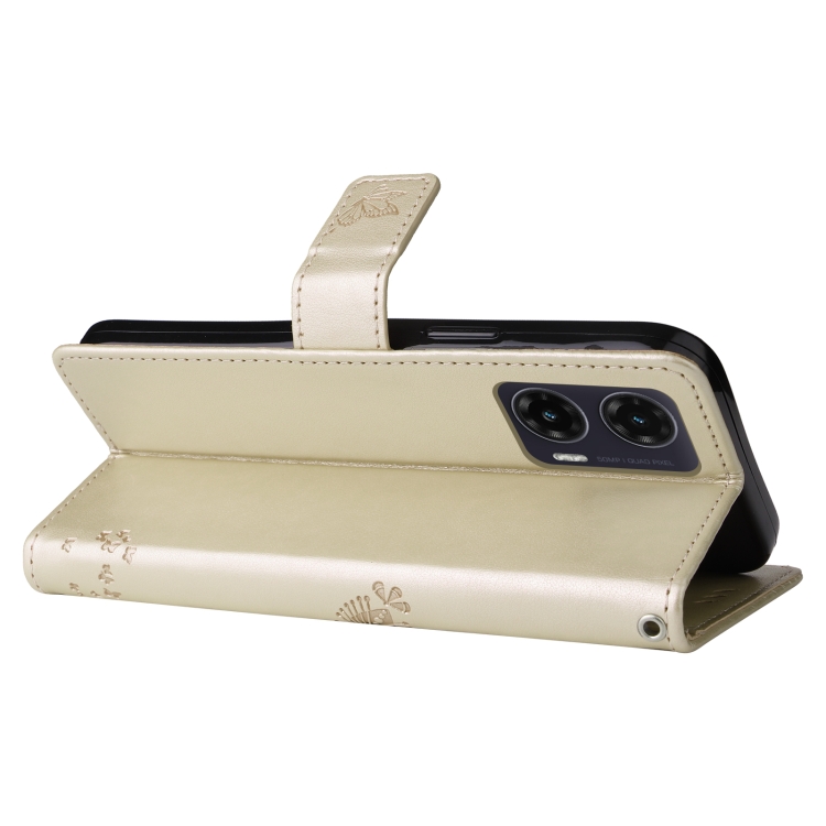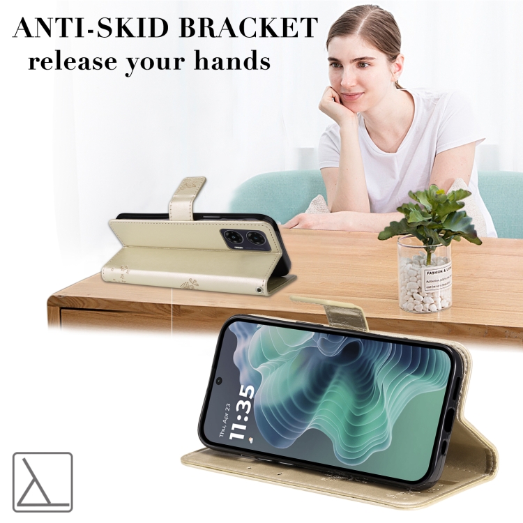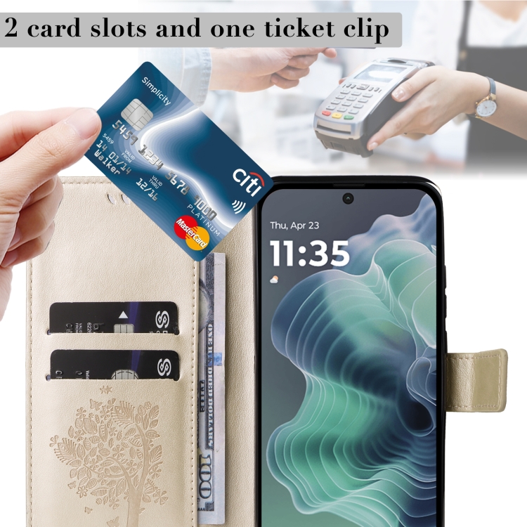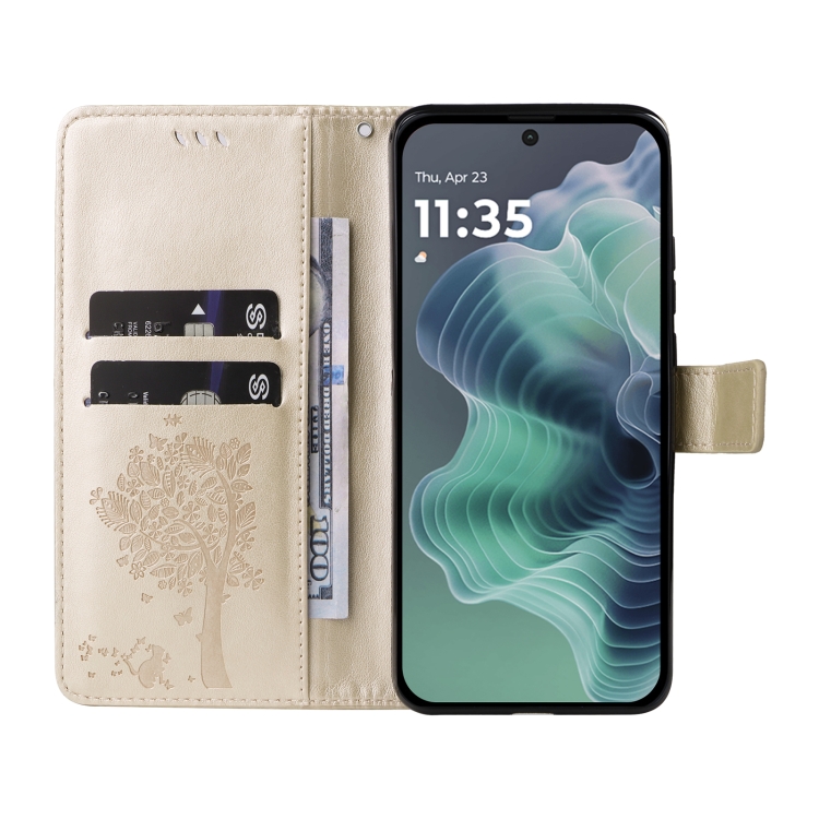 Funda de Cuero con Tapa para Motorola Moto G35 con Diseño Árbol y Gato en Relieve (Dorada)