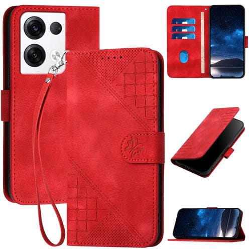 Funda de Cuero con Tapa y Cordón para Oppo Reno10 Pro 5G Global Yx0080 con Diseño En Relieve de Mariposa y Cuadrícula (Rojo)