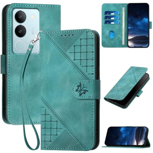 Funda de Cuero con Tapa y Cordón para Vivo V29 5G Global Yx0080 con Diseño En Relieve de Mariposa y Cuadrícula (Azul Claro)