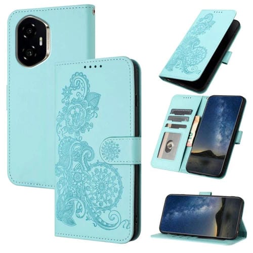 Funda de Cuero con Tapa y Flor de Datura en Relieve para Honor 300 (Azul Claro)