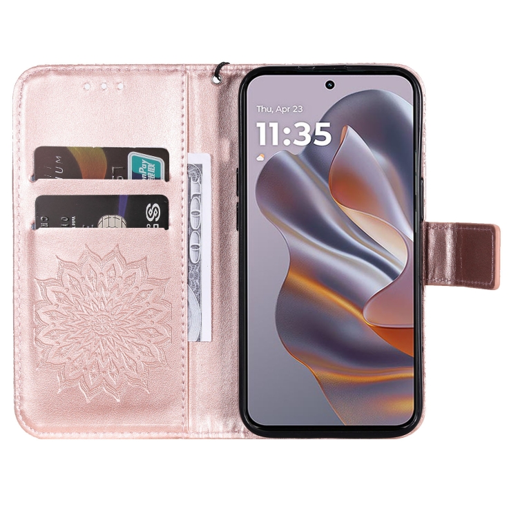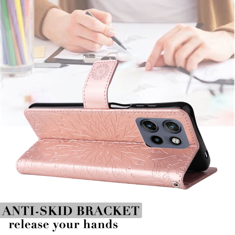 Funda de Cuero con Tapa y Diseño Girasol en Relieve para Motorola Edge 50 Neo (Oro Rosa)