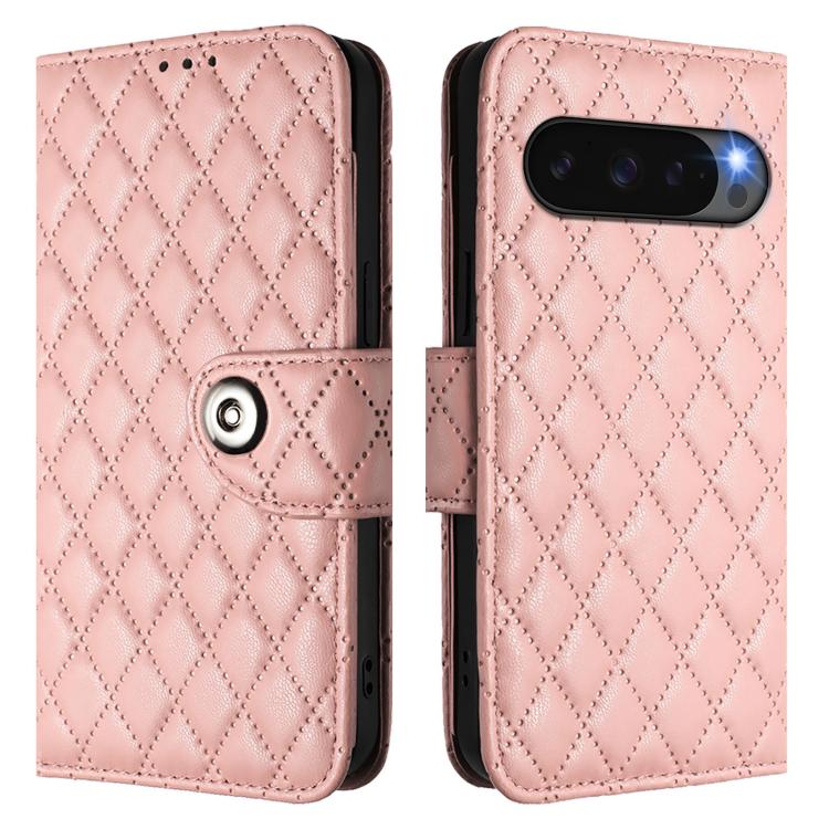 Funda de Cuero con Tapa y Textura Rombal Global para Google Pixel 10 5G con Cordón (Rosa Coral)