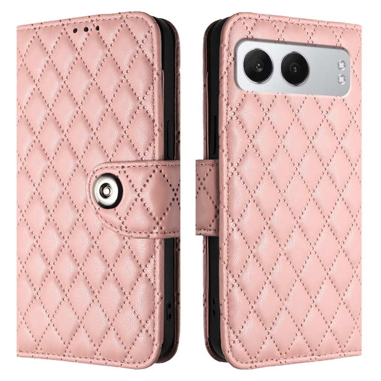 Funda de Cuero con Tapa y Textura Rombal para OnePlus Nord 4 5G con Cordón (Rosa Coral)