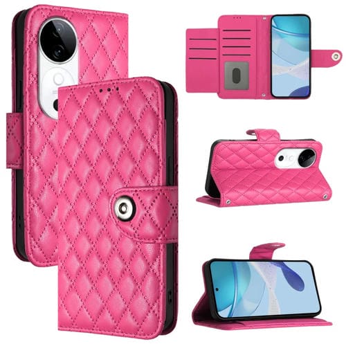 Funda de Cuero con Tapa y Textura Rombal para Teléfono Vivo S19 con Cordón (Rosa Rojo)