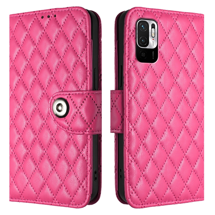Funda de Cuero con Tapa y Textura Rómbica para Redmi Note 10 5G/Note 10T 5G con Cordón (Rosa Rojo)