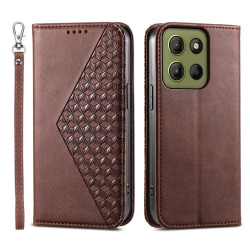 Funda de Cuero Magnética para Motorola Moto G15 con Textura de Becerro y Cuadrícula Cúbica (Marrón)