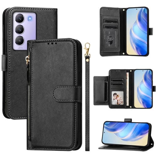 Funda de Cuero para Teléfono con Cremallera y Ranuras para Múltiples Tarjetas para Vivo Y100 Idn/T3 5G Idn (Negro)