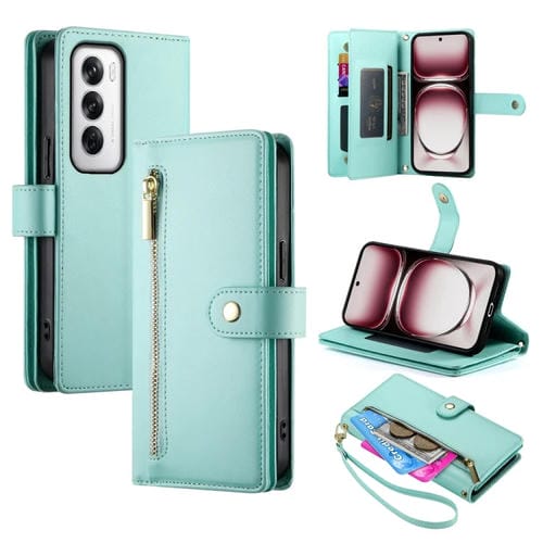 Funda de Cuero para Teléfono con Nueve Ranuras para Tarjetas y Cremallera para Oppo Reno12 Global (Verde Menta)
