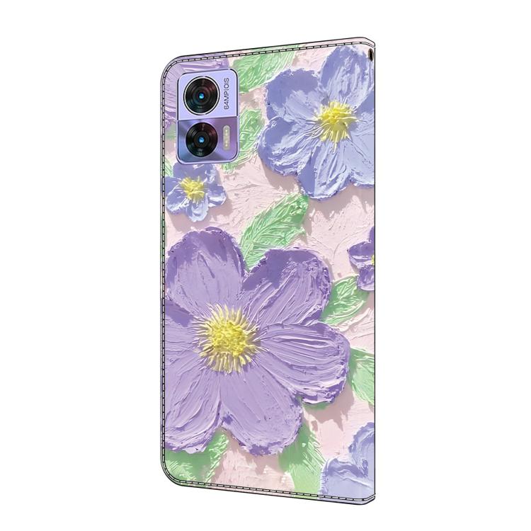 Funda de Cuero Pintada a Mano para Motorola Edge 30 Neo con Pintura al Óleo y Flores Moradas