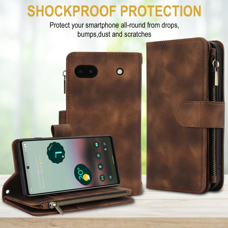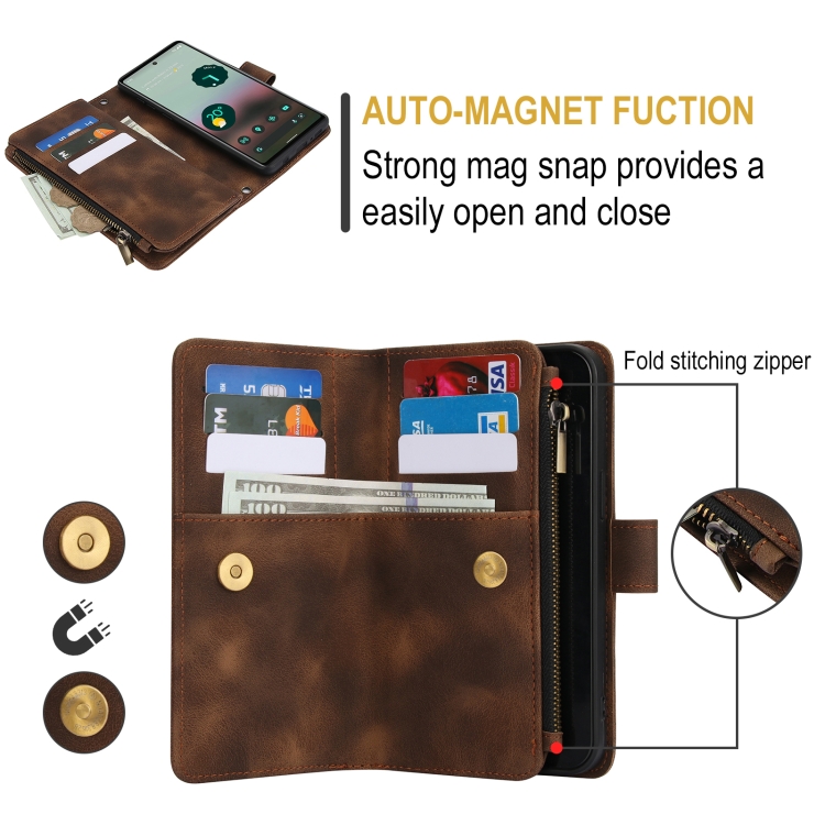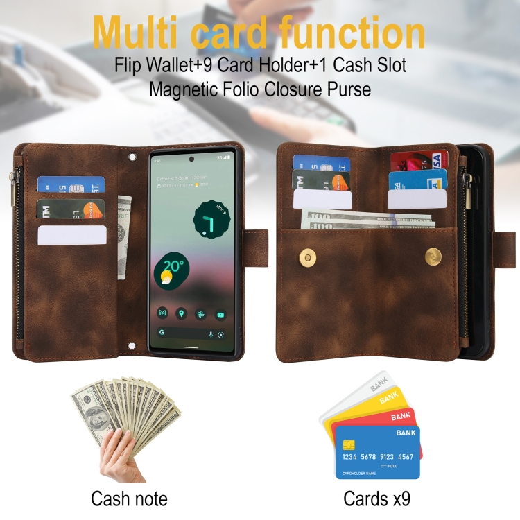 Funda de Cuero Rfid con Cremallera para Google Pixel 6 Dream con 9 Tarjetas y Cordón (Marrón)