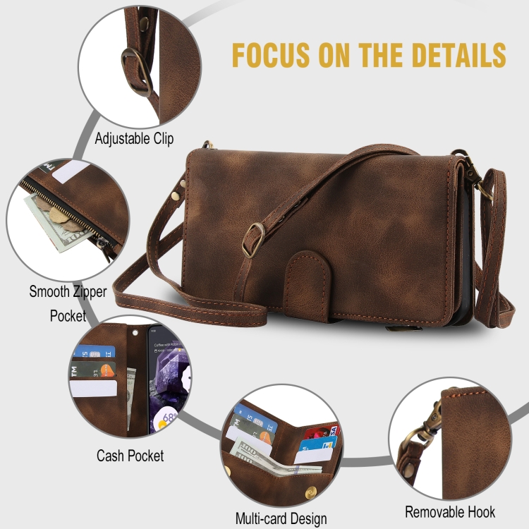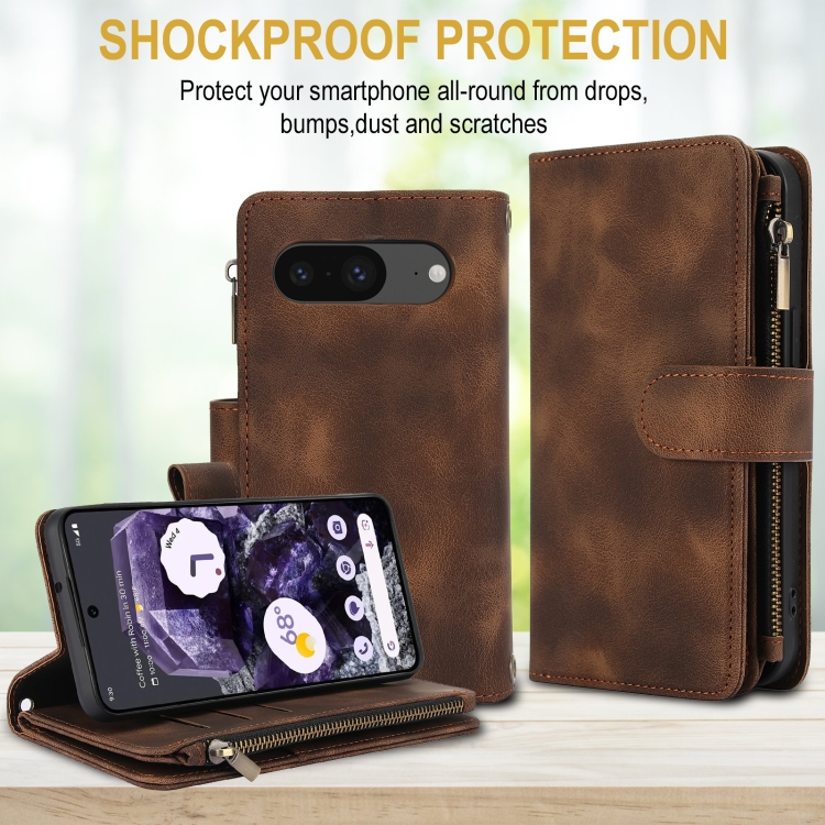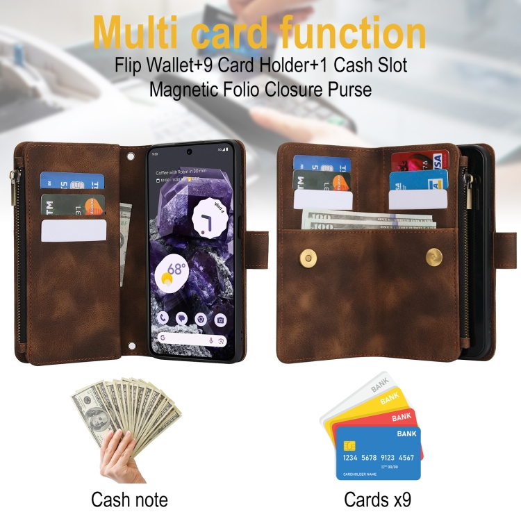 Funda de Cuero Rfid con Cremallera para Google Pixel 8 Dream con 9 Tarjetas y Cordón (Marrón)