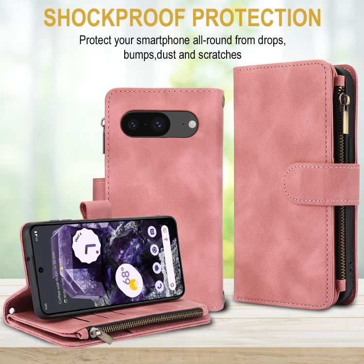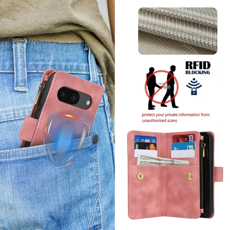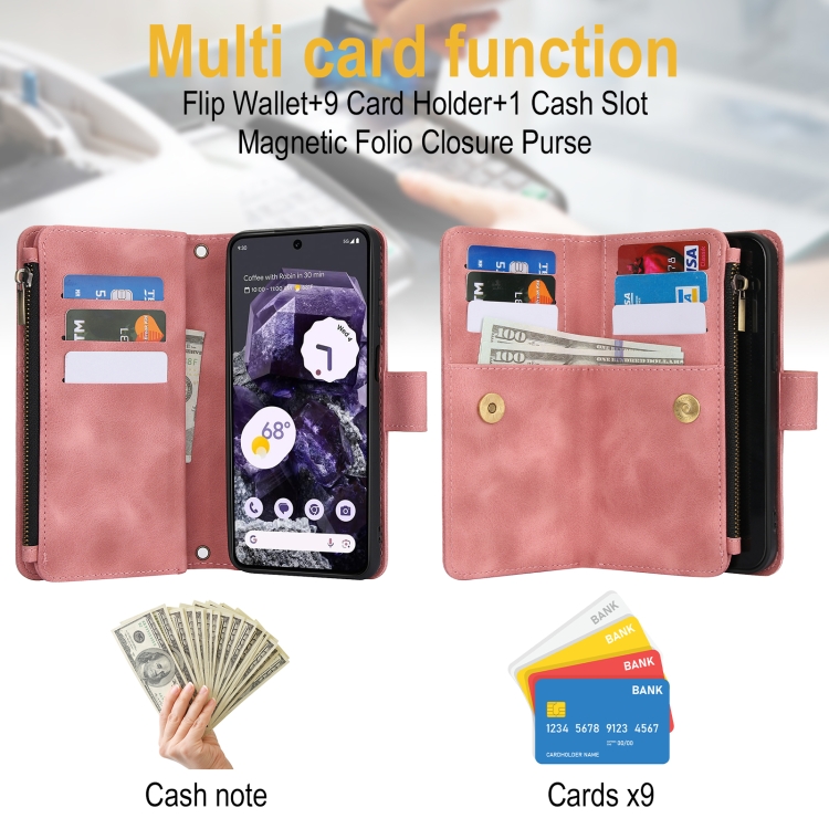 Funda de Cuero Rfid con Cremallera para Google Pixel 8 Dream con 9 Tarjetas y Cordón (Oro Rosa)