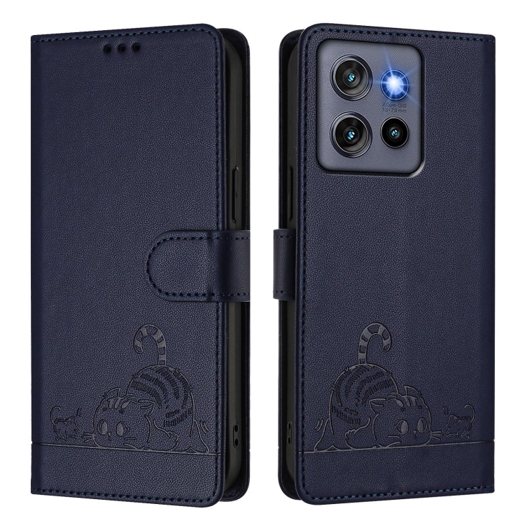 Funda de Cuero Rfid para Motorola Edge 50 Neo con Estampado de Rata y Gato en Relieve y Cordón (Azul)