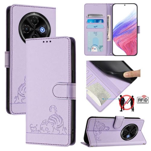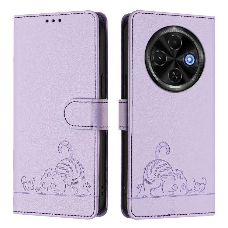 Funda de Cuero Rfid para Tecno Spark 30C 5G y Pop 9 5G con Estampado de Rata y Gato en Relieve y Cordón (Morado)