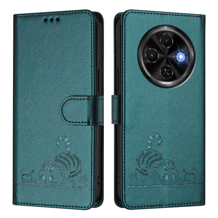 Funda de Cuero Rfid para Tecno Spark 30C con Estampado de Rata y Gato en Relieve y Cordón (Verde Pavo Real)